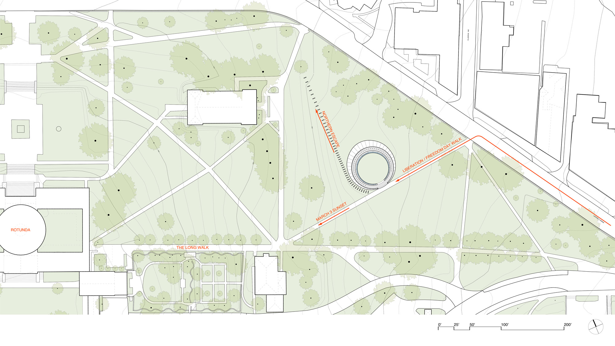The Memorial to Enslaved Laborers (MEL) at the University of Virginia honors the lives, labor, and perseverance of the community of enslaved African Americans who built UVA and sustained the daily life of faculty, students, and administrators at the University. The memorial, the result of a collaborative design process involving UVA students, the Charlottesville community, and descendants of the enslaved, is sited in the valley on the east side of the Lawn. Located directly east of Jefferson’s famous rotunda, it sits in an area called the Triangle of Grass, part of the UNESCO World Heritage Site. Adjacent to this site is University Avenue, which connects to downtown Charlottesville. Our final landscape site plan indicates passage of time. The memorial itself is oriented to the North and the Northern escape path is marked by 48 granite stones referencing the 48 years that the University held slaves. The diagonal brick path leading the memorial aligns with the angle of the setting sun on March 3, Liberation and Freedom Day. The circular lawn is planted with flowering crocus bulbs that will bloom in February, which is Black History month, and continue through March 3rd. After the flowers fade, the lawn will return to a space for gathering.